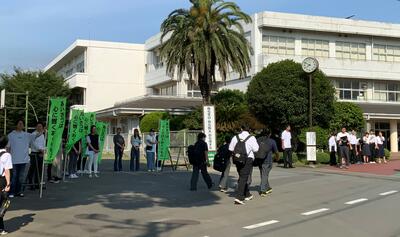 本校でも、PTA役員や生徒会役員、教職員が玄関前に立ち、元気にあいさつを交わし合いました。